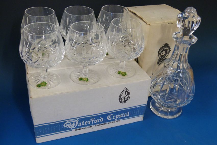 A set of six Waterford Crystal Kenmare pattern brandy glasses and decanter in original boxes