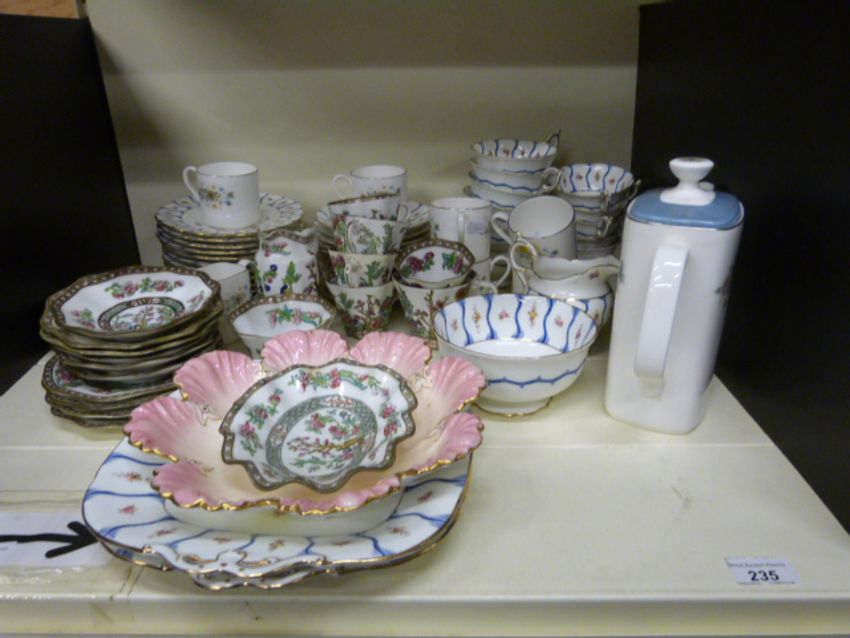 A Coalport hand decorated part tea set with two cake plates, Doulton Pastorale coffee pot, Indian Tree pattern tea ware