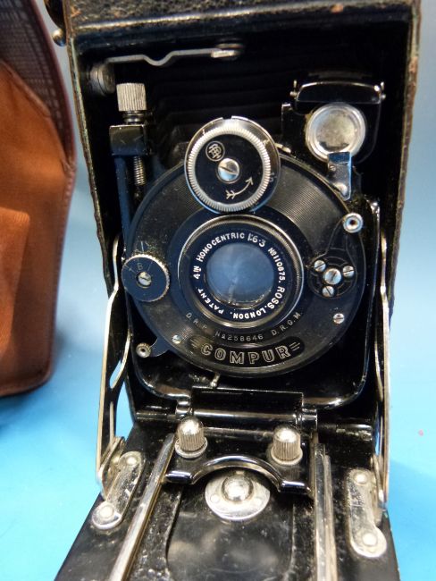 Three vintage cameras including Brownie, Ensign and Soho Cadet, together with Vivitar automatic and a pair of Jockey Club binoculars.