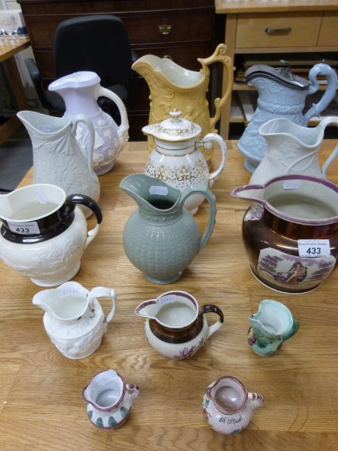 A collection of 19thC relief moulded jugs comprising of Copeland, Parian, Sam Alcock, Ridgeway, Sunderland lustre etc