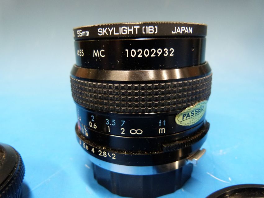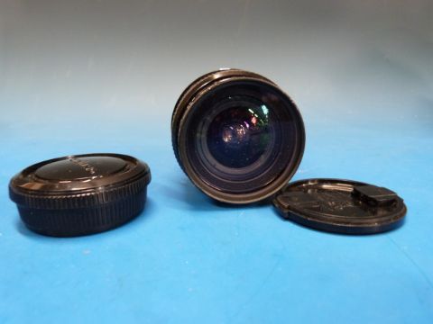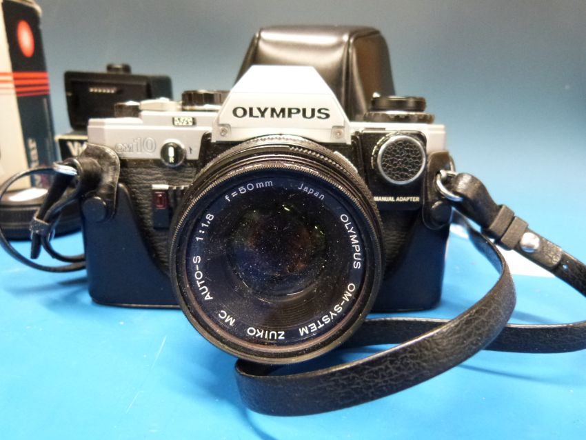Olympus OM10 SLR camera together with Vivitar flash, Kiron 24mm lens (and related paperwork)