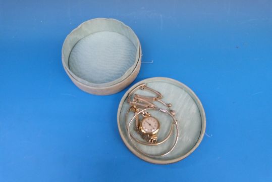 A 9ct gold ladies watch, hallmarked silver bangle and white metal bracelets inside an embroidered dressing table box