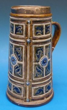 A silver mounted Doulton Lambeth jug by George Tinworth, with Art Nouveau incised and applied decoration contained within beaded borders. Various impressed marks to base (23.5cm tall)