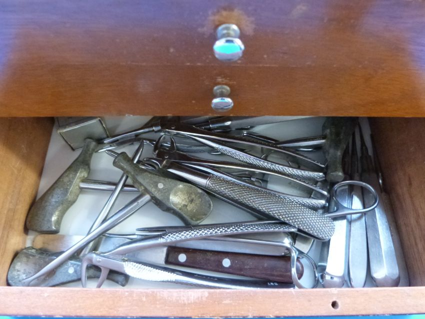 A wooden dentist's chest with graduated drawers containing dental items with plaque "S F Roper"