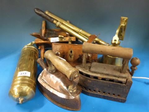A mixed lot of plough planes, a bell, an extinguisher, irons etc