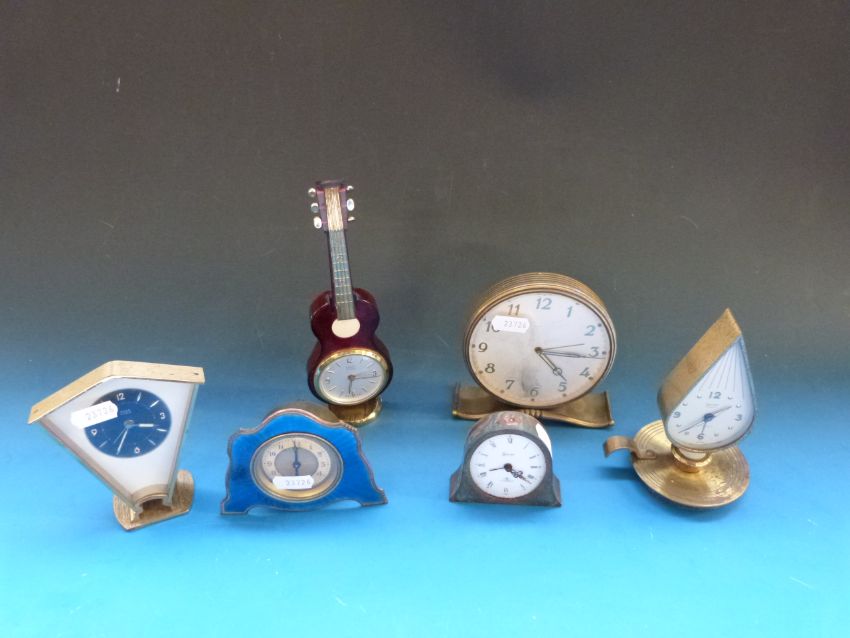 A collection of small novelty clocks including guitar, nightlight and guilloche enamel