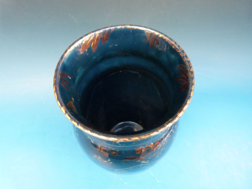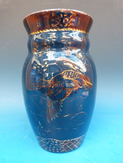 An Alfred Powell for Wedgwood Arts and Crafts lustre vase with hand decoration of kingfishers and ducks roosting and in flight against a mountainous backdrop. Impressed Wedgwood mark, hand painted Alfred Powell mongram and No 3843 together with a 1982 Richard Dennis Wedgwood Exhibition sticker bearing with ref P5, 23cm tall.