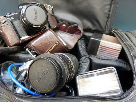 A Canon AL-1 semi-automatic SLR camera and equipment in case, including telephoto lens, together with filters, sharpers, soft focus effects etc and a 500mm F8.0 telephoto lens by Paragon together with a Tskina 28-70mm example and a "doubler" attachment lens