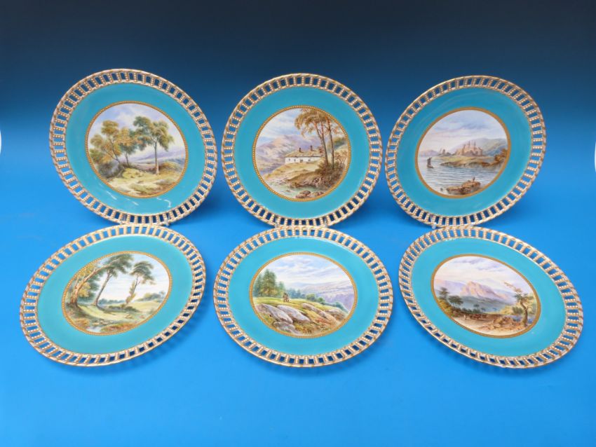 Six jewelled, pierced and hand painted dessert plates, the central landscapes painted by Robert Perling or James Bradley c1865. Provenance Bonhams London lot 249 12/12/07