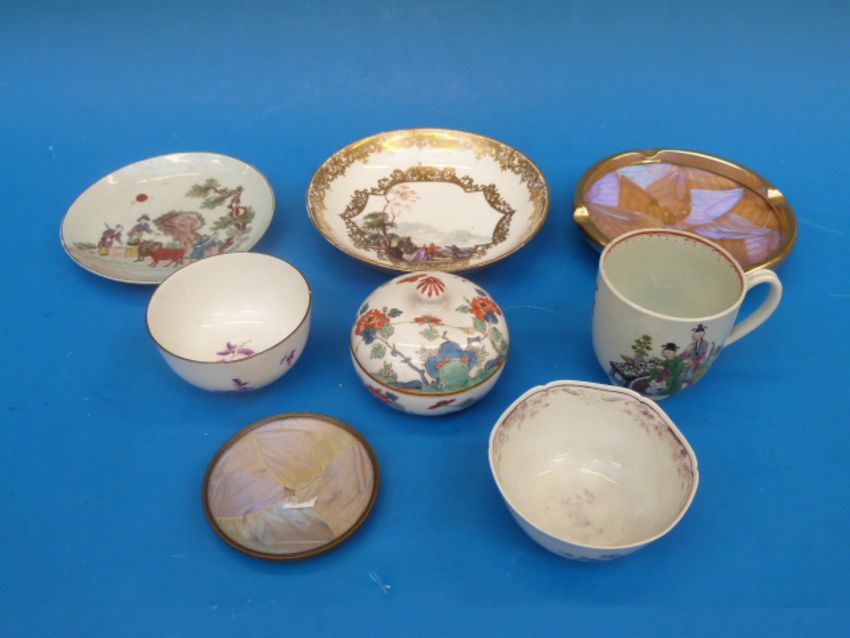 Three pieces of hand decorated Meissen, an 18thC scalloped teabowl and a mismatched cup and saucer decorated with Chinese scenes