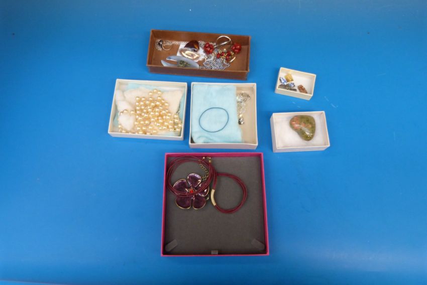A quantity of jewellery including a 9ct gold and cubic zirconia ring, white metal pendant, a silver ring set with tigers eye, silver charms etc