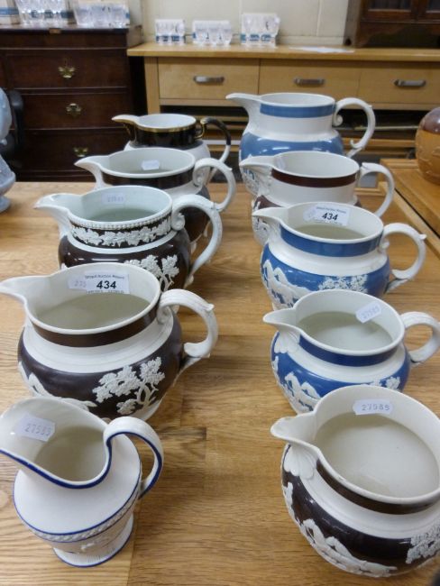 A collection of relief moulded jugs to include Turners, Spode style etc.
