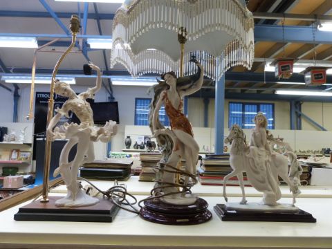 Three Guiseppe Armani Florence figurines two in the form of lamps ,Lady on Horse, Juliette and one other.