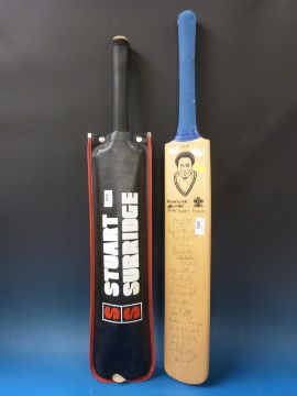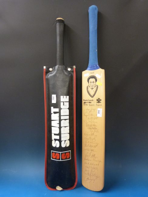 A Stuart Surridge cricket bat in cover and a Monte Lynch signed bat 1991