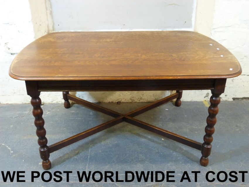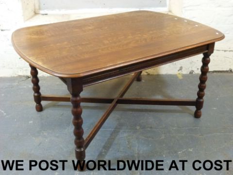 An oak dining table with bobbin turned legs united by a cross-stretcher (length 150cm, width 105cm, height 76cm)