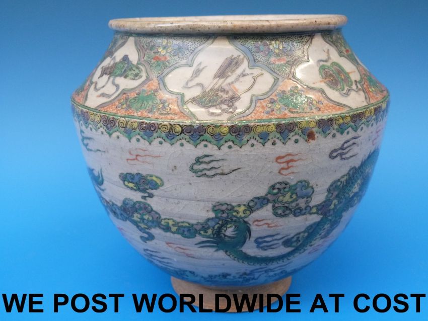 A Chinese famille verte jardinere with dragon among wave decoration (18cm tall)