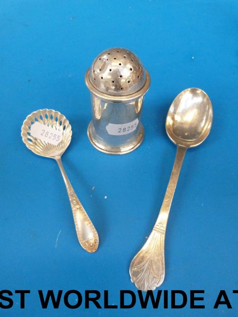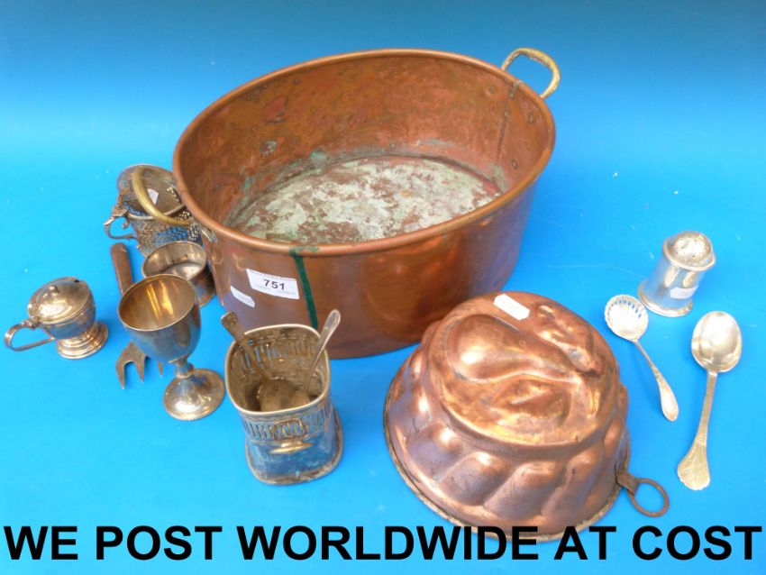 A silver pepper pot and two spoons together with silver plate, a copper jelly mould and pan