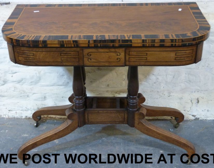 A 18thC mahogany and coromandel wood fold-over games table, the flame mahogany top with coromandel cross banding and edging with boxwood inlay, raised on four turned columns and scroll legs (width 91cm, depth 45cm, height 74cm)
