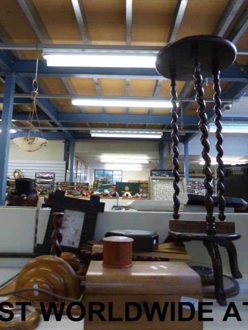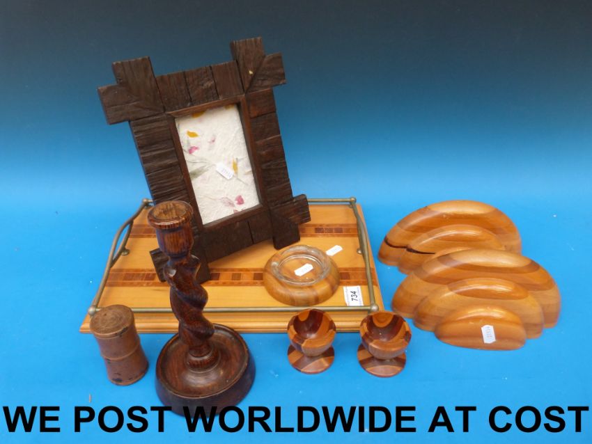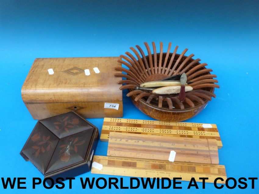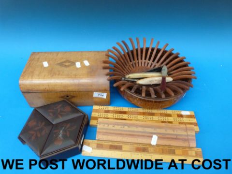 New Zealand "Sovereign" cribbage board etc wooden sherry tray, oak bowl, jardiniere stand etc