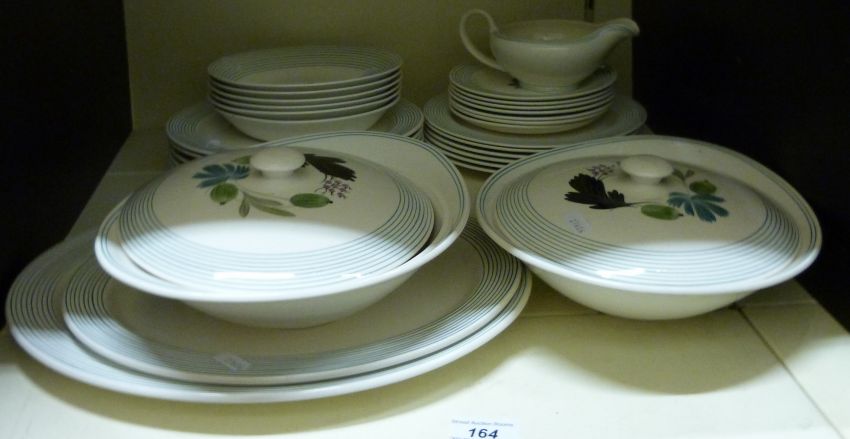 A collection of Susie Cooper "Gooseberry" pattern dinnerware including meat plates, two lidded tureens, plates, bowls etc