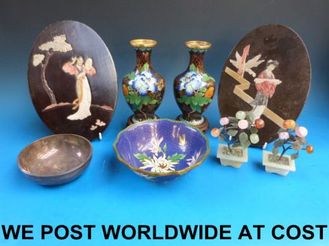 A pair of 20thC Chinese cloisonne vases together with a bowl, two hardstone trees and two hardstone pictures