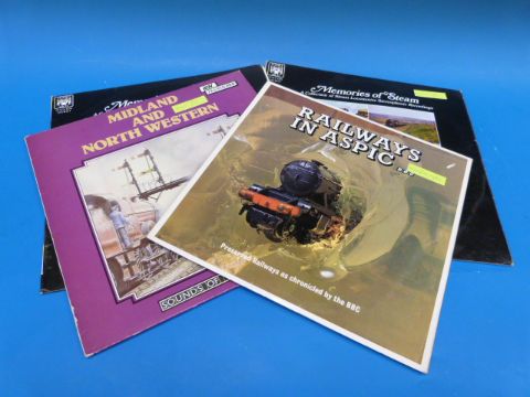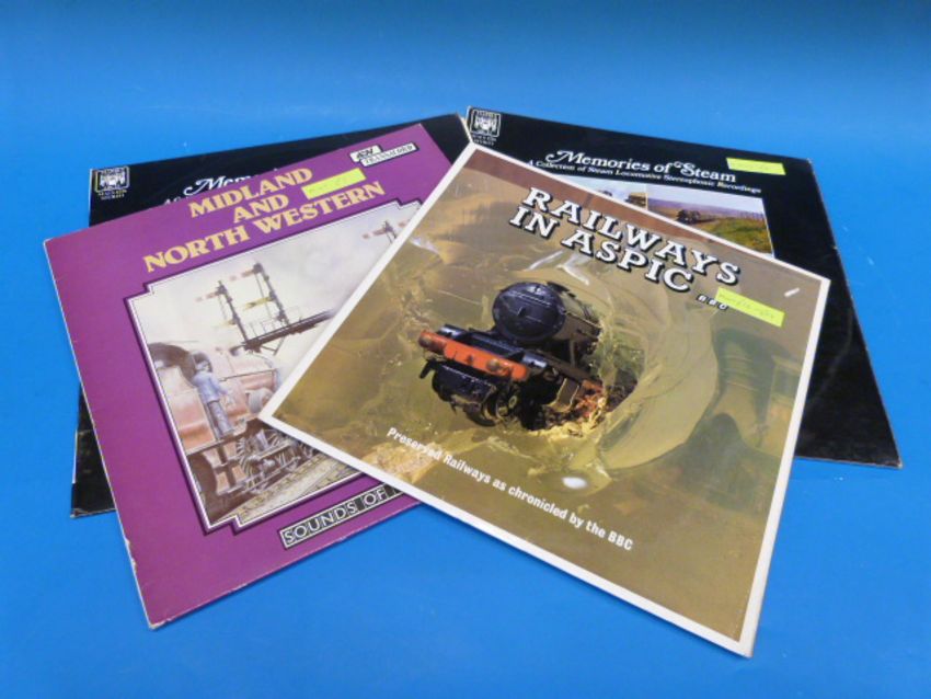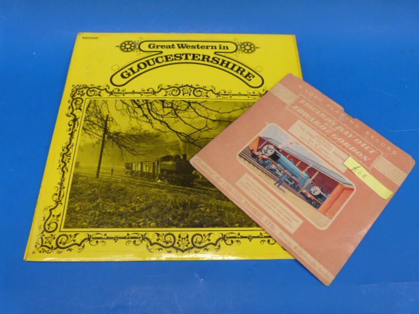 Fourteen Steam Train records (two duplicates) - some collectable. The lot also includes the extremely rare EP with two "Thomas The Tank" stories (Edward's Day Out and Edward & Gordon) the first ever to be issued on record (1957) and read by the author, Rev W. Awdry from Amberley. There is also another of local interest "Great Western in Gloucestershire" (Stroud & Haresfield feature).