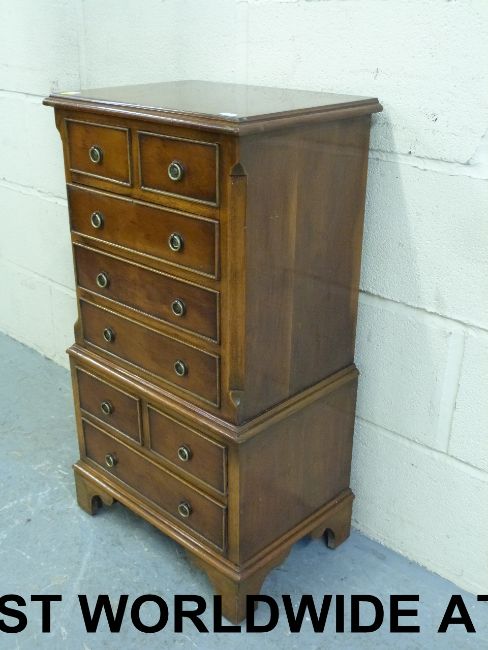 A small Georgian style apprentice sized (could be used for jewellery) chest on chest, fitted two over three and two over one drawers (width 42cm, depth 31cm, height 78cm)