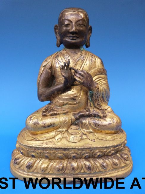 A Tibetan gilt bronze figure of a Lama with flowing robe and hands in Dharmachakra (21cm tall)