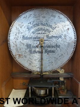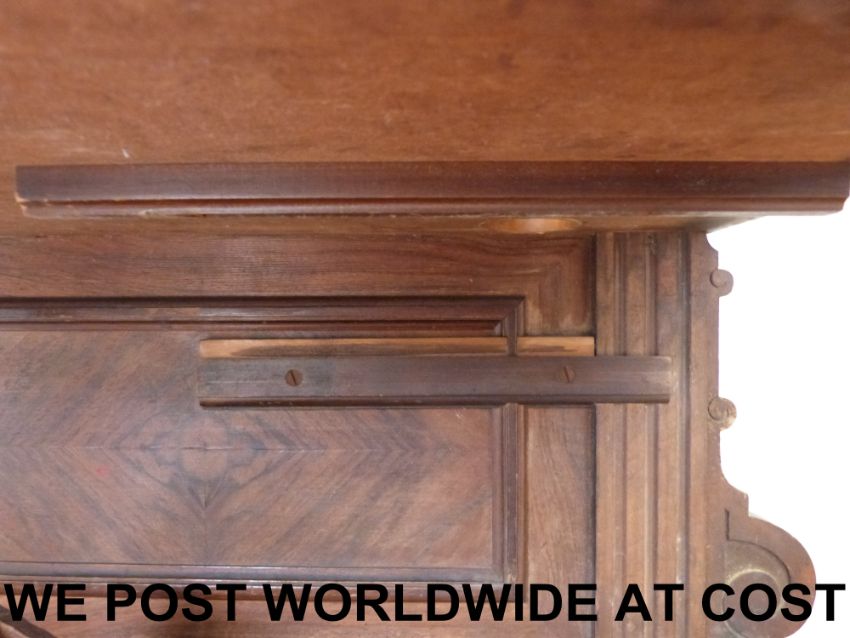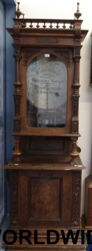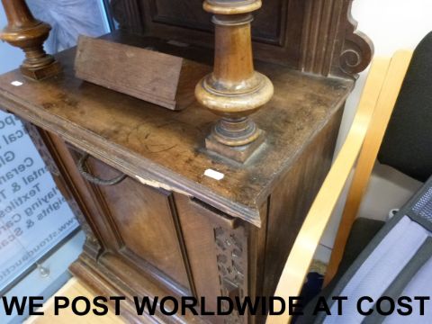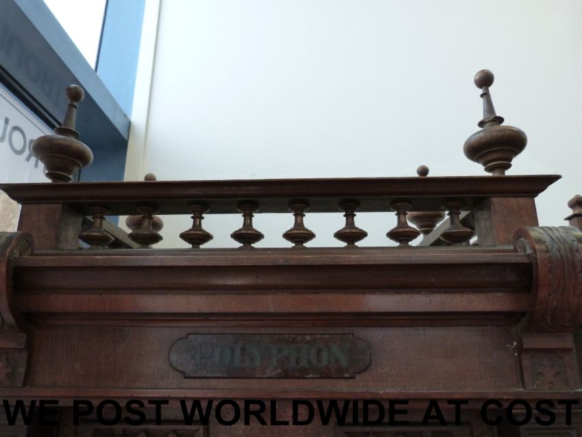 An upright 19 5/8 Polyphon music box No.104 playing on two combs with right hand side coin slot, repeat mechanism and fixed stud wheel drive. Serial number 10048 on pressure bar, spring dated 1898. Mounted in ornate case with decorative finials and carved columns to door, with matching disc bin and a quantity of discs (approx 207cm tall, 72cm wide, 44cm deep). All teeth and tooth tips present.