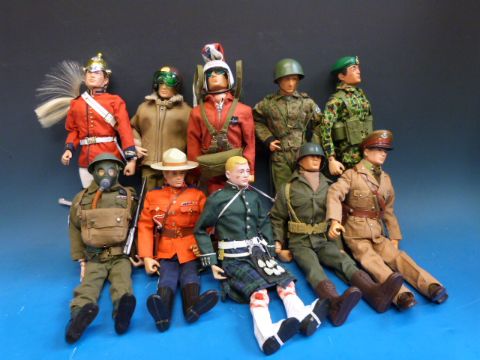 Ten Action Man figures, Tommy Gun Paratrooper, US Machine Gunner, Royal Marines Combat, Argyle and Sutherland Highlanders, SOTC British Infantryman, Royal Canadian Mounted Police, Lifeguard, British Army Officer, Red Devil Parachutist and Armored Car Commander (all in uniforms)