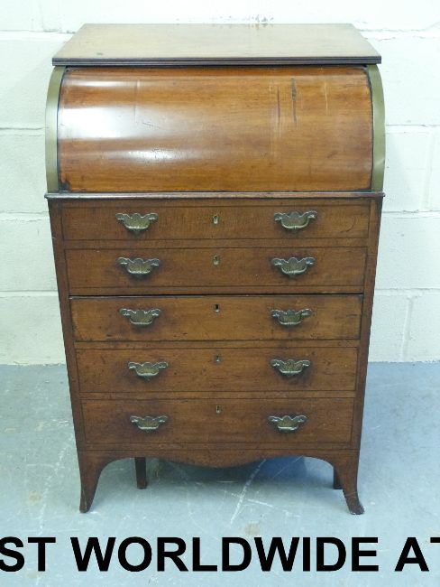 A Georgian wash stand with lift-up top and drop-down barrel front opening to reveal lift-up mirror, wash bowl and water container, fitted single drawer with two false drawers above and two below. The base is fitted with pull-out waste tray to one side and bidet to other (63cm wide, 58cm deep, 95cm high)