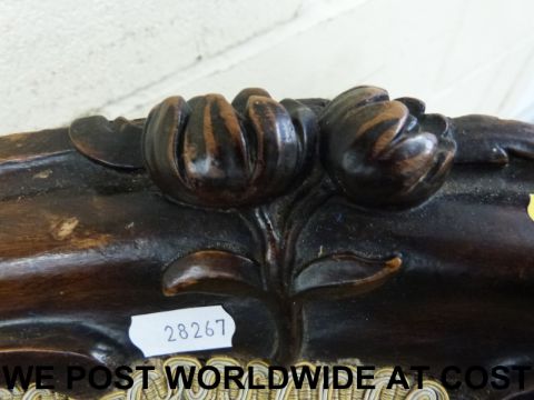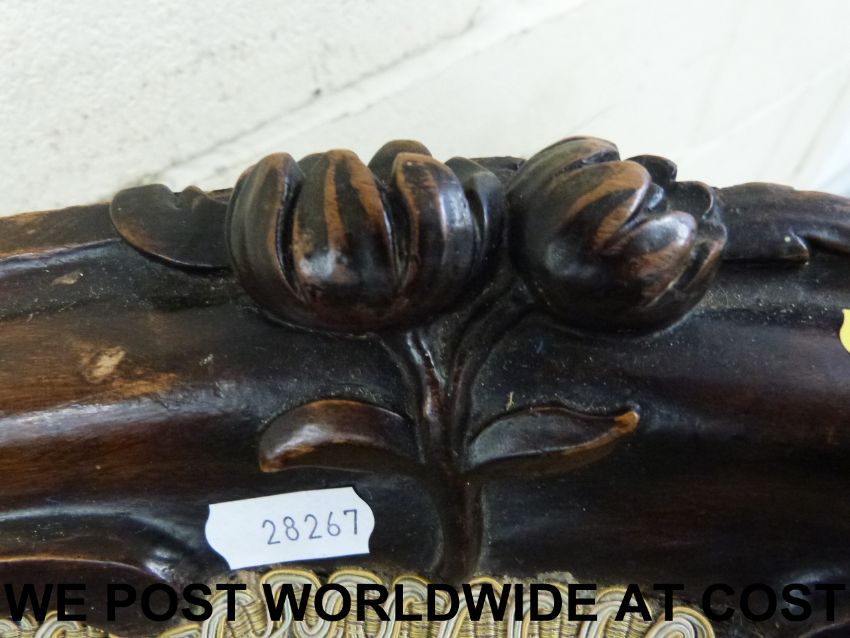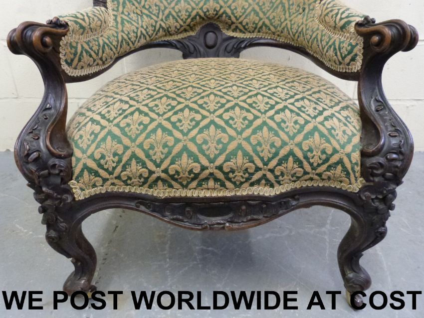 A 19thC carved mahogany armchair with fleur de lys patterned fabric