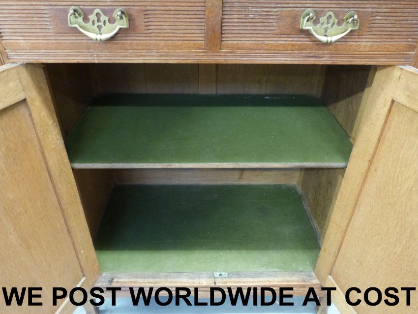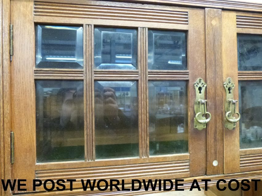 An Arts and Crafts oak breakfront dresser, having central double cupboard with bevelled glazed doors, mirror below and two drawers and two cupboards to base, flanked by long cupboard doors with bevelled glass upper sections and stylised inlaid decoration, possibly Wylie & Lochhead or Shapland & Petter (width 178cm depth 53cm height 193cm)