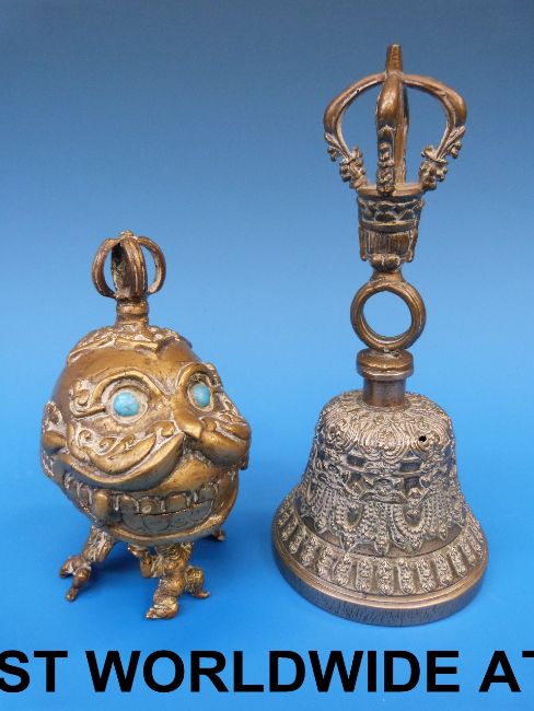 A Tibetan bronze handbell cast on the shoulders with eight characters and with calligraphy inside, the open ring handle with mask (18cm) together with a lidded pot in the form of a mythical creature with inset turquoise eyes