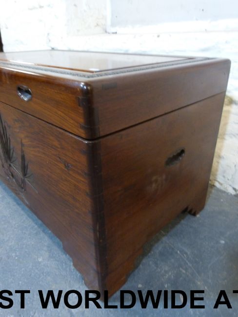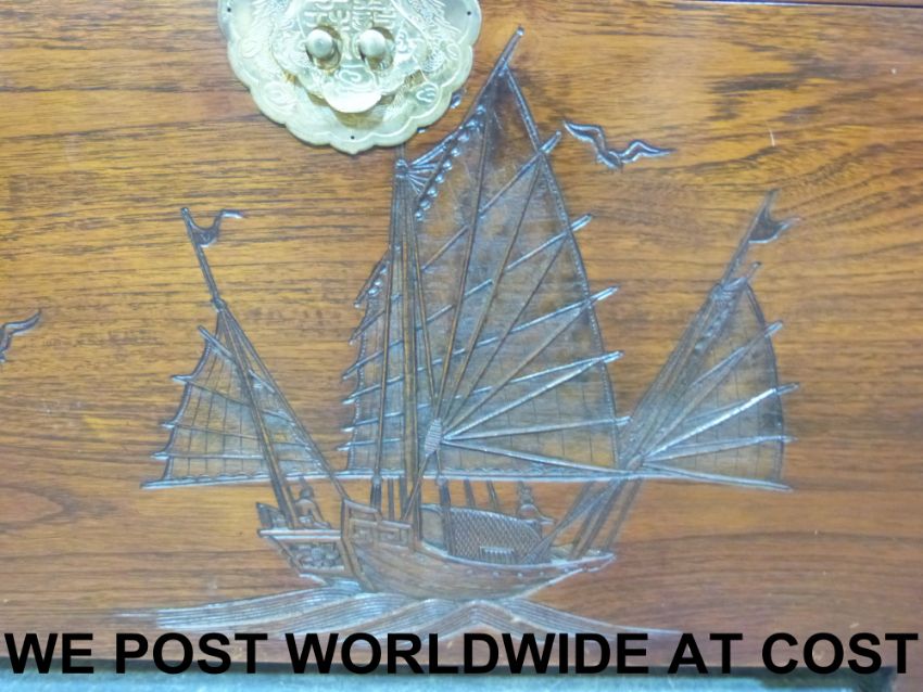 A Chinese camphor wood chest with carved junk decoration inset handles and tray inside