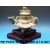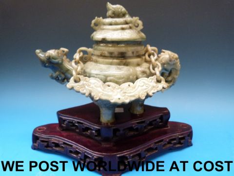 A Chinese jadeite large tripod teapot and cover with coiled dragon finial, the stone with some dark green splashes, all on fitted wooden stand (17cm - 23cm including stand)
