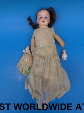 A 19thC bisque headed doll with open mouth, flixed blue eyes, brown hair and soft body (32cm tall)