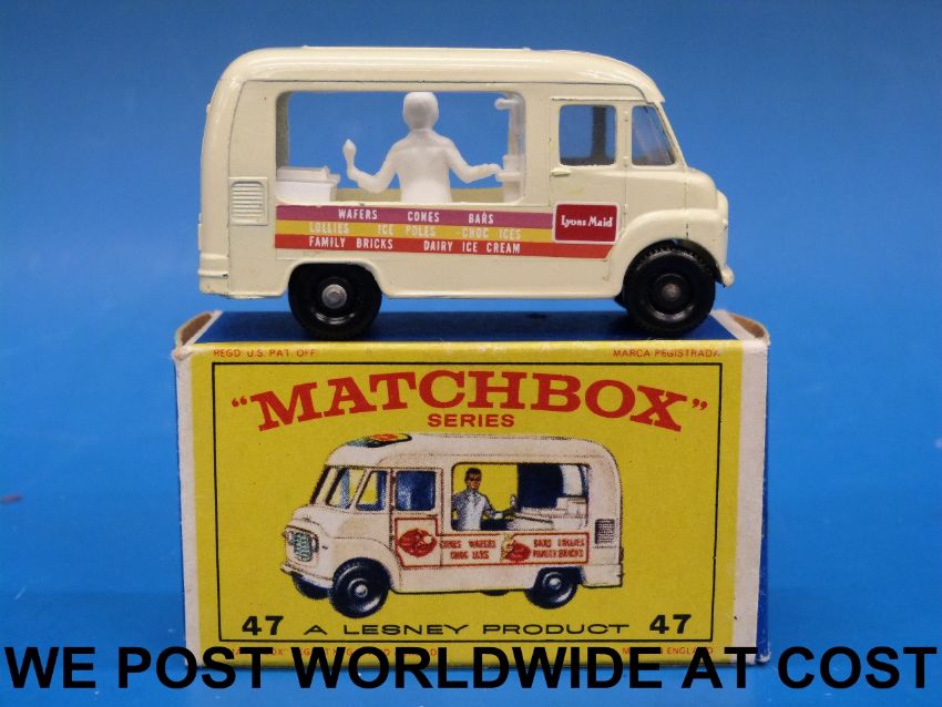 Matchbox 47 diecast model Lyons Maid Ice-Cream Mobile Shop in cream with Lyons Maid striped decals (in original box)