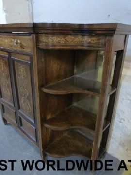 A 19thC rosewood credenza with foliate inlay decoration, fitted drawer over cupboard, flanked by open shelves (width 138cm, depth 40cm, height 97cm)