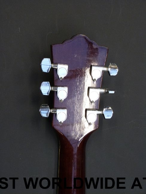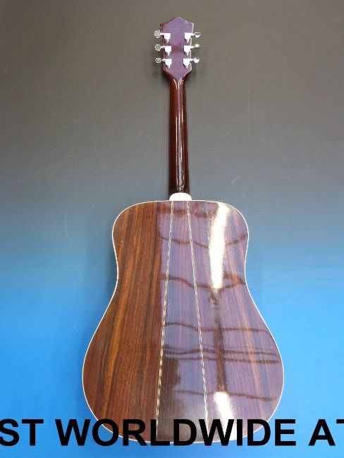A Kiso Suzuki six-string acoustic guitar with round back and mother-of-pearl inlay
