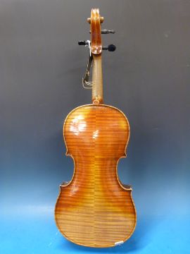 A late 19thC copy of a Jacobus Stainer violin, probably German made (380mm flame back) printed label inside and impressed name to back.
