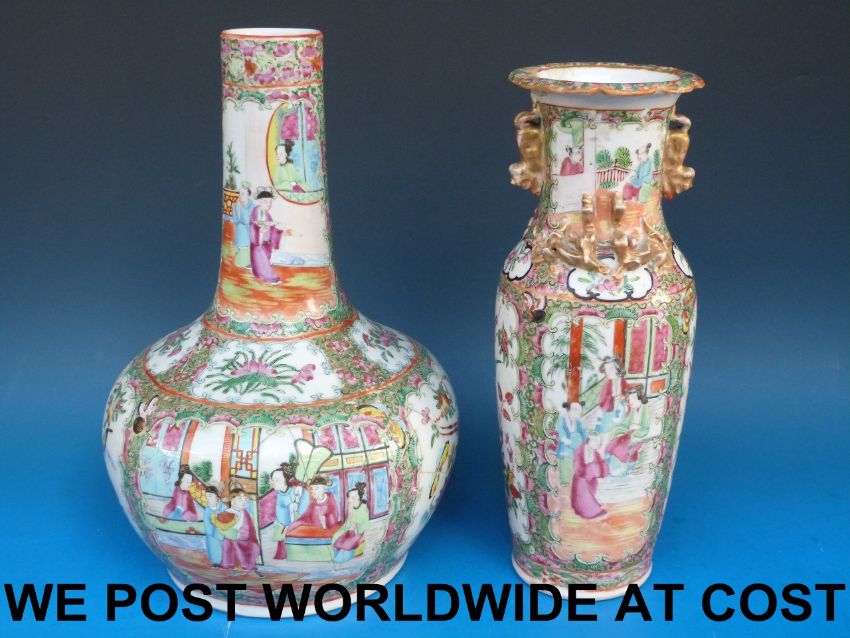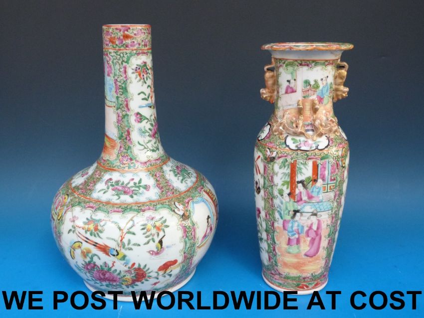 Two Chinese Canton vases, one of bottle form (33 cm high) the other with twin handles (31cm high)