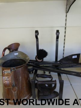 A collection of fireside items including two similar companion sets, copper jugs, fire dogs etc