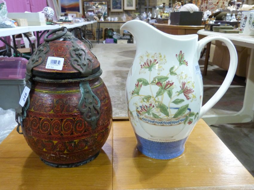 A large Sarah's Garden Wedgwood jug and a metal mounted eastern pot