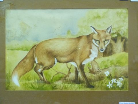 A framed watercolour of a fox