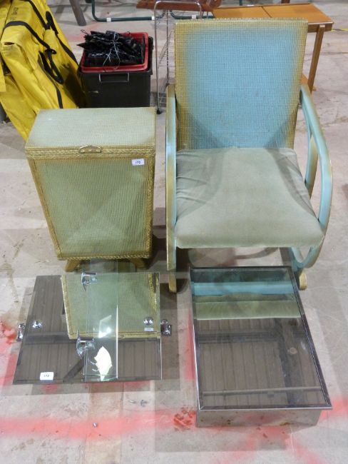 A bathroom mirror together with matching shelf, Lloyd Loom linen basket and chair and a mirror front cabinet