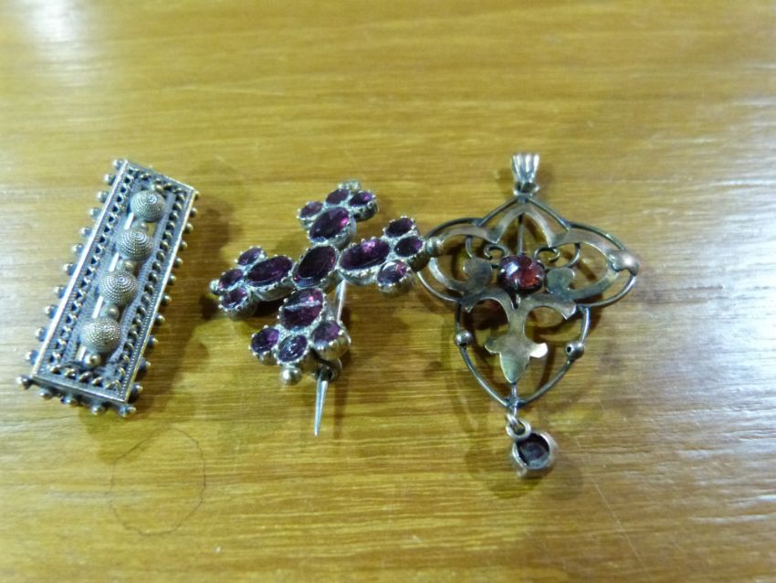 A Victorian yellow metal pendant stamped 9ct together with two brooches