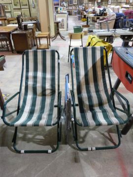 Two green striped garden loungers and a folding chair
