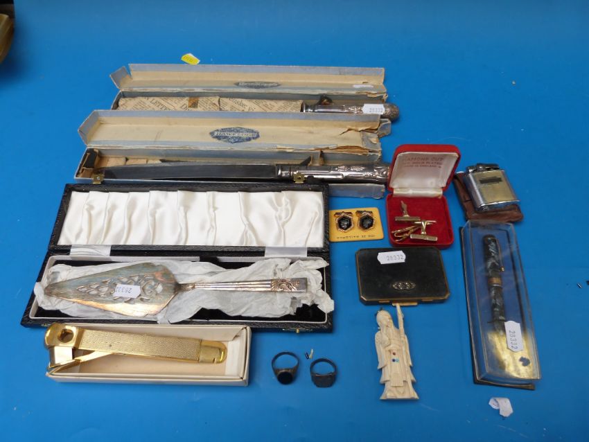 A Stratton compact, ivory figure, Ronson lighter, plated bread knives, RAF silver ring, Conway Stewart 388 pen