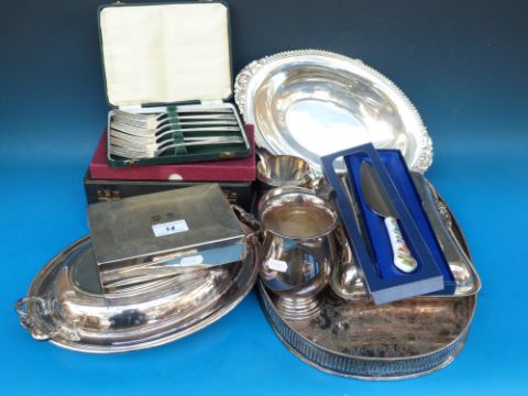 A collection of plated items to include cased cutlery, cigarette box, dishes etc